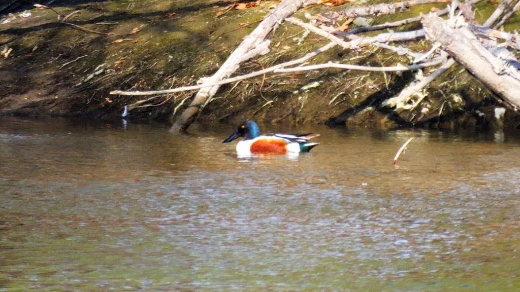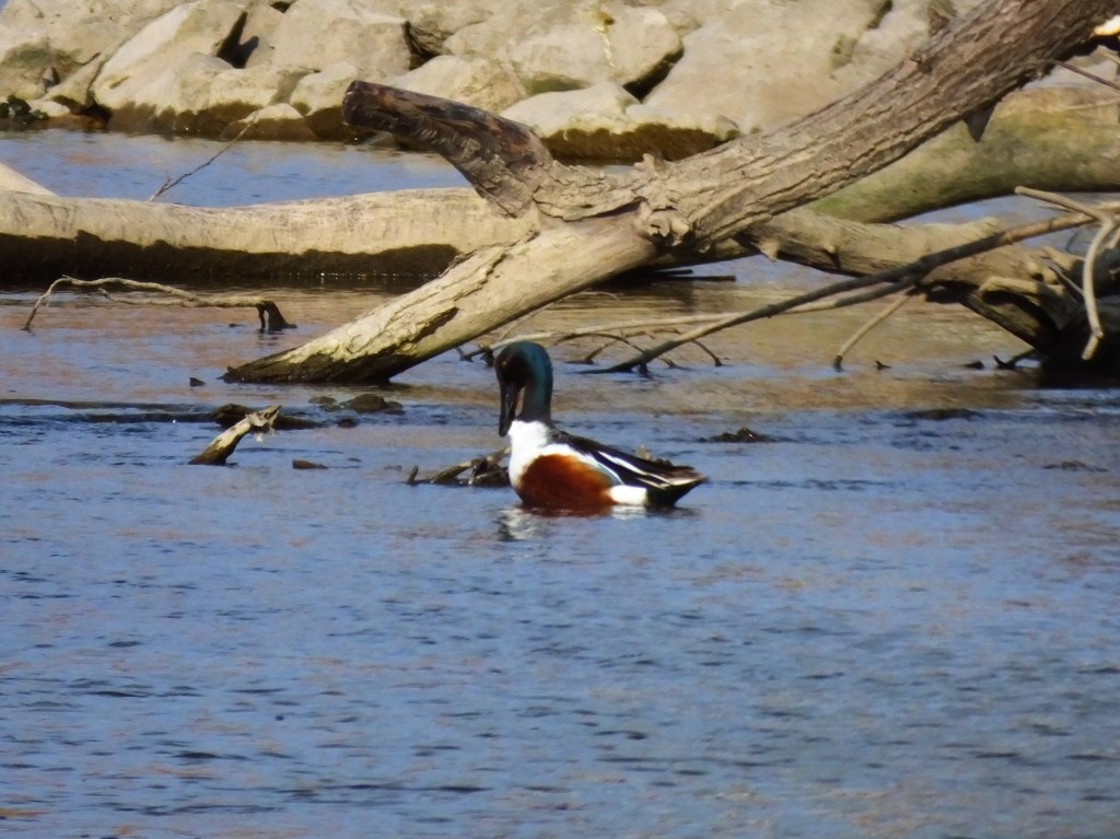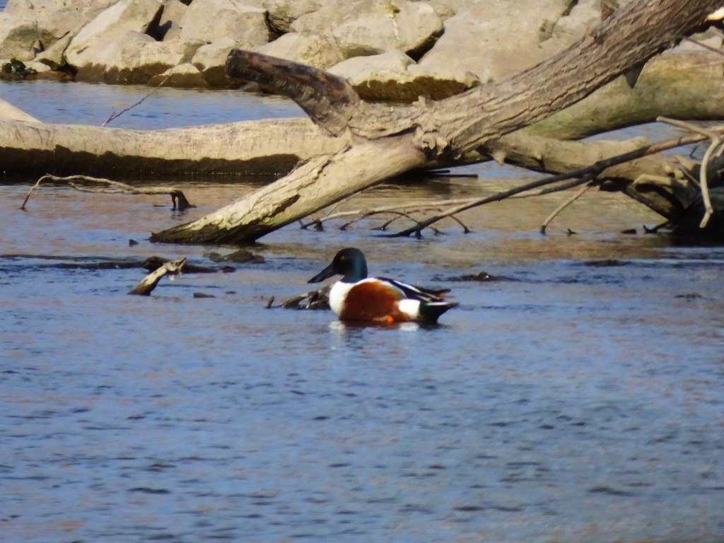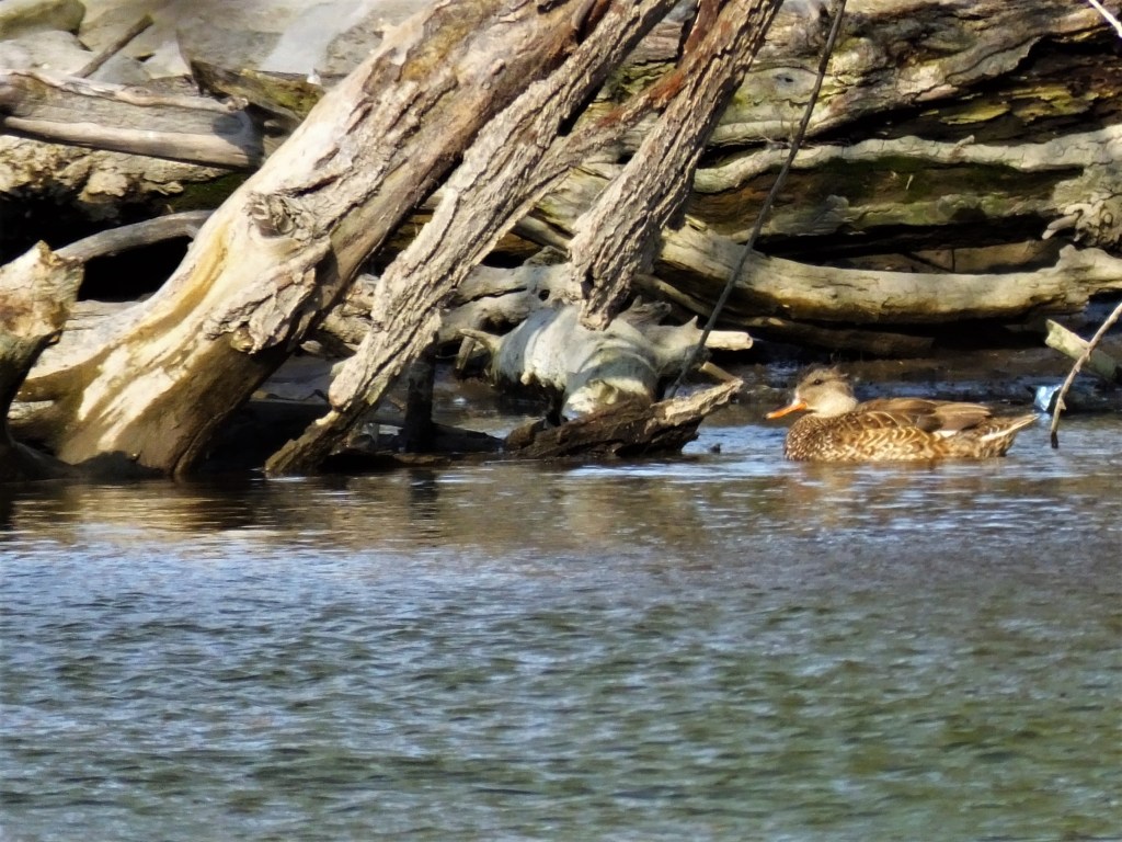 There were tree swallows hunting insects over the river, and they seemed to be coming and going from one tree on the other bank, but I couldn’t get a picture to save my life. Instead, I was treated to a different little hunting party, two pair of wood ducks and a pair of teals slowly steaming upriver and munching something off the top of the water as they went.