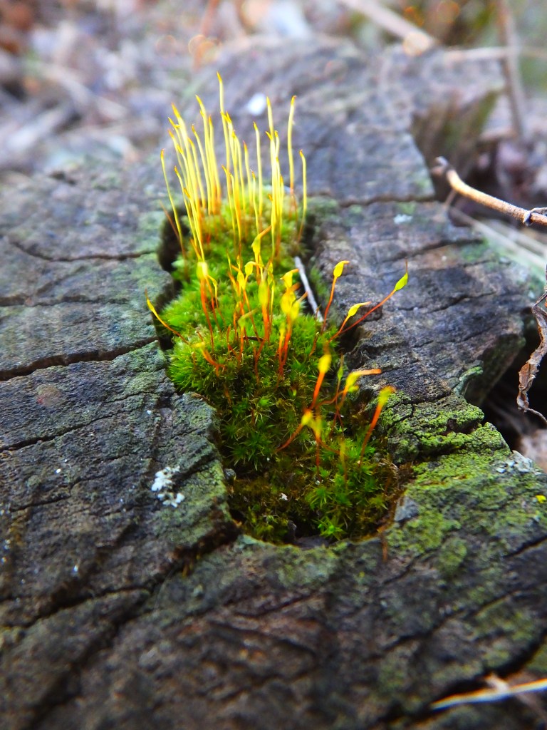 There was the usually chorus of chickadees, robins, cardinals, juncos, and woodpeckers throughout the park, but nobody was in a posing mood this morning. Instead, I found this tiny patch of moss growing in a natural planter and glowing in the early morning sun, and that’s gonna have to be your splash of color for today.