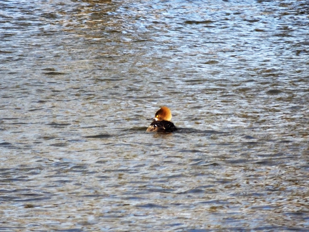 The situation on the river is similar, but I did manage a better-than-usual picture of the buffleheads, and I spotted what appears to be a nonbreeding male hooded merganser, from the looks of his bright yellow eye.