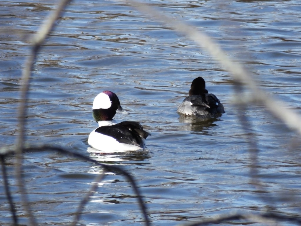 Oddly, there wasn’t a duck on the pond this morning during either of my visits, but happily, there are still ducks on the river, and the goldeneye odd-couple seem to have joined forces with the buffleheads. Mallards are still plentiful.