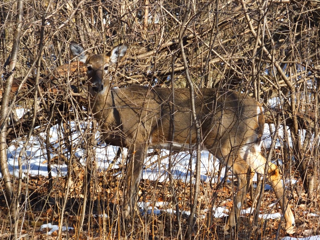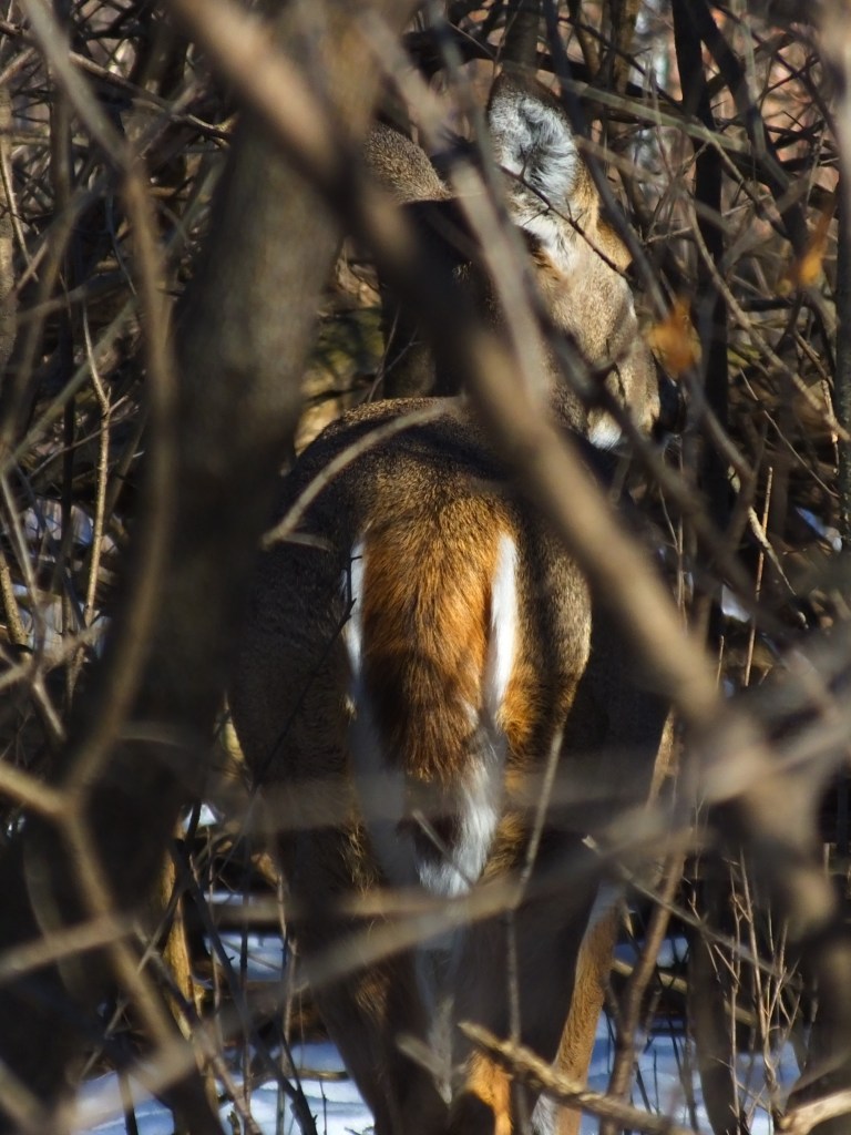 Anyway, I haven’t seen hide nor hair of the deer since disturbing their nap back in December. No, I don’t believe they left, but they sure were lying low. This morning, they were still lying down, but not so low any more that I couldn’t find them for the first time in 2021. There were four of them, possibly the four we used to see cavorting on the soccer fields last summer, but only three would fit in this picture.