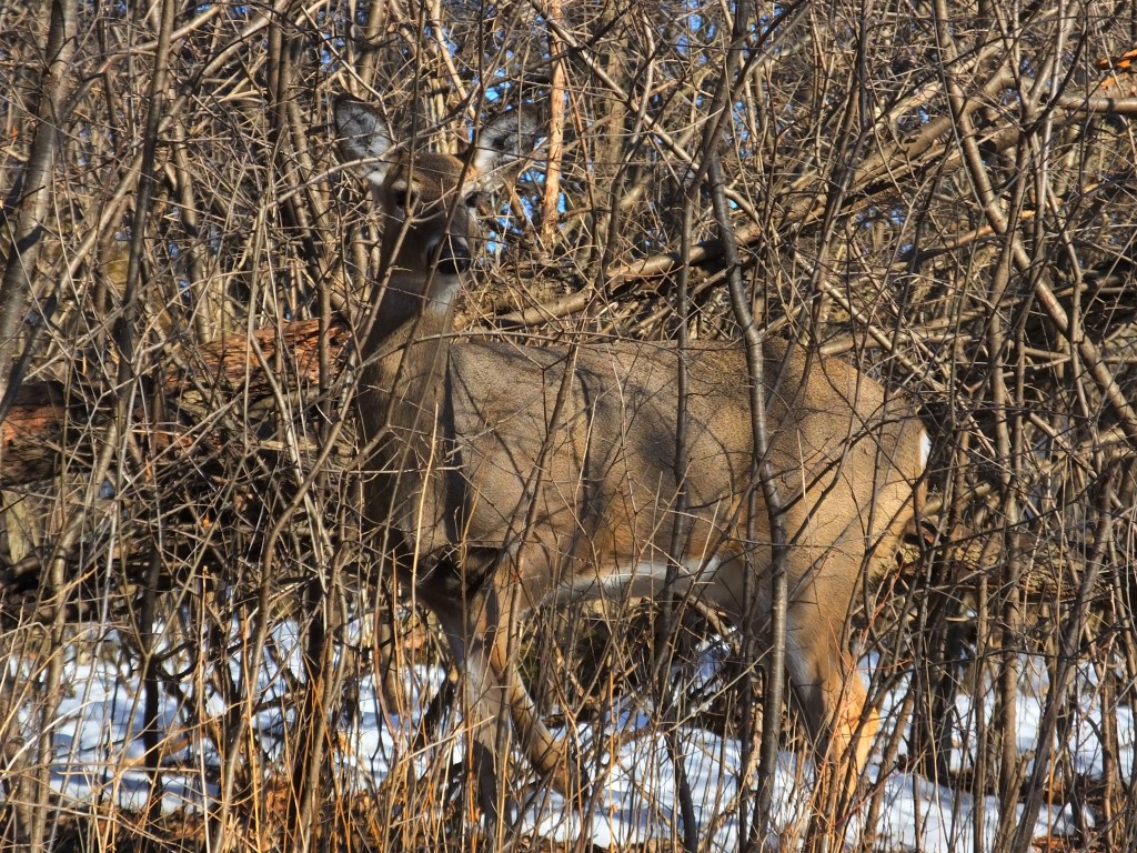 Yikes! And to think I thought it was cold yesterday. At least I was better dressed for it this time. Even the deer quartet we’ve been seeing lately appear to have sought someplace warmer. Otherwise, it was a beautiful morning in Estabrook, and the mergansers and goldeneyes were on the river at the south end as usual lately.
