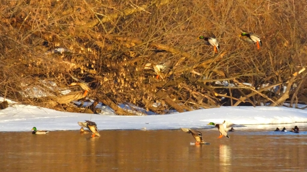 In other news, an eagle swung by the far north end and launch all the non-diving ducks into the air, but didn’t come south enough for me to take even a bad picture. Instead, here’s some mallards settling back down after it the coast was clear.