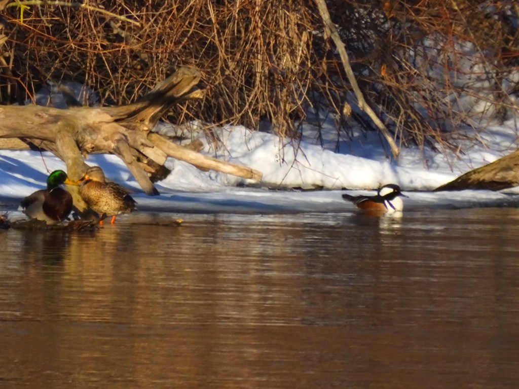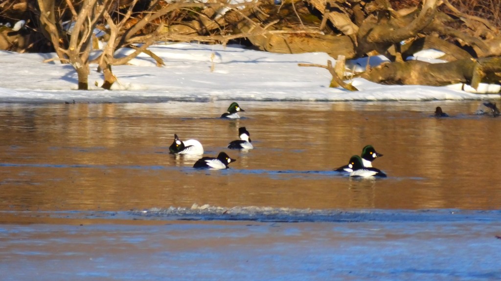 And the buffleheads and some goldeneyes, along with plenty of mallards, a goose or two now, and even a young herring gull, are back on the upper river, just above the falls, now that a lot of the ice has cleared out and there’s some open water again.
