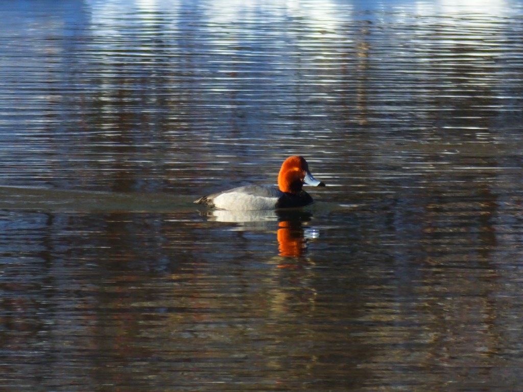 First, and most exciting for me, because I’ve never seen this creature before, is the aptly-named Redhead (Aythya americana), another diving duck. There were two males and a female on the upper river with the mallards and goldeneyes. We are in their “nonbreeding” range, so these folks are just passing through, but we’re sure glad that stopped in, if only for a moment.