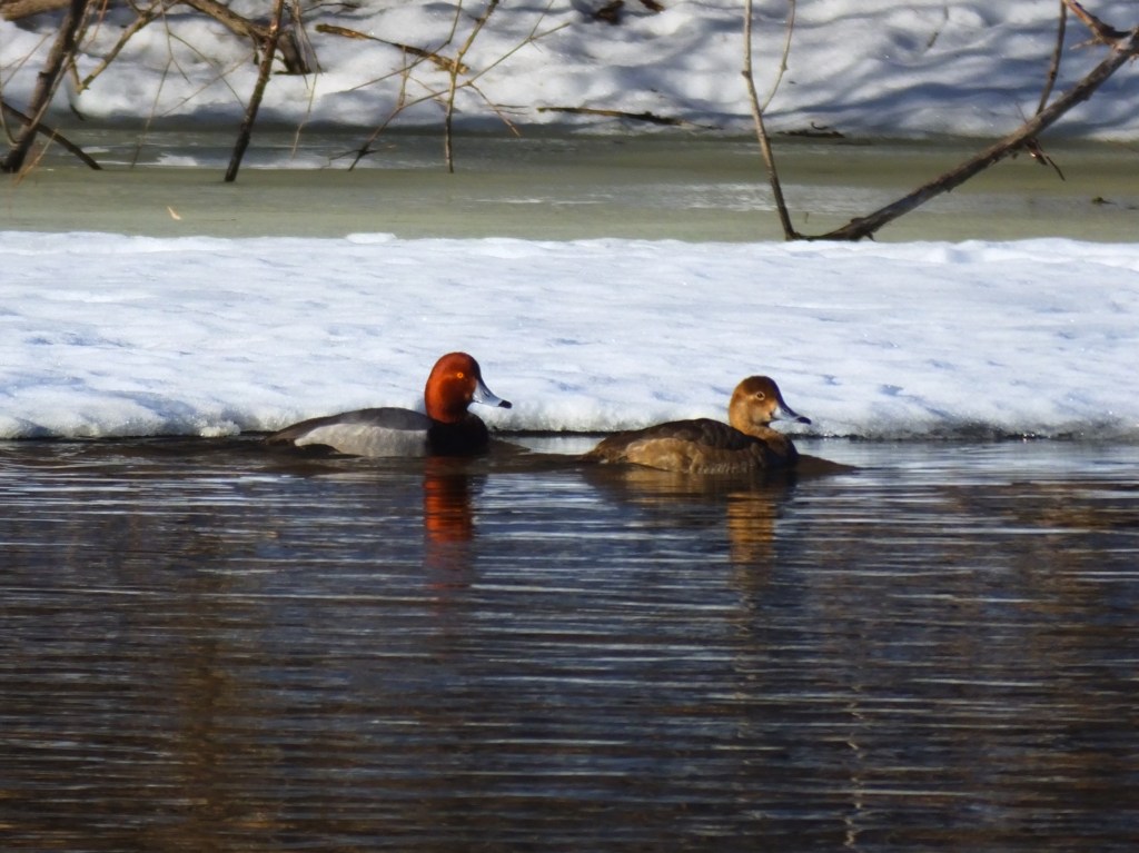 The activity on the river continues to evolve with the loss of ice, but our pair of redheads are still hanging around on the upper river just downstream from the southern island.